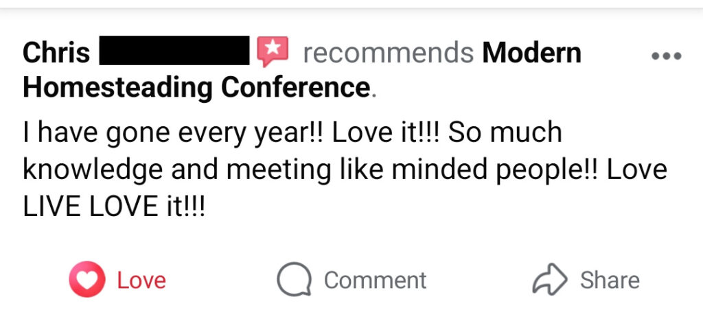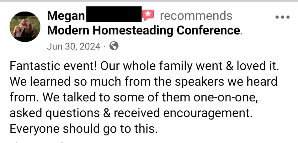 We’re confident in the quality, integrity, and value of this event. That’s why thousands of families come back year after year—and why we pour everything into making the Modern Homesteading Conference worth every mile, minute, and dollar.